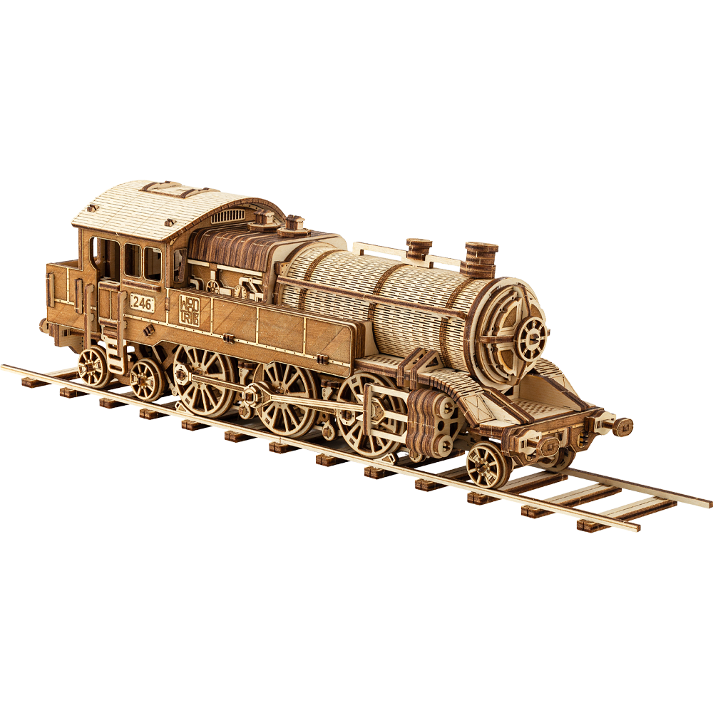 This DIY train puzzle includes the locomotive itself and a set of rails. Our engineers carefully recreated the signature details of a vintage steam engine — the smokestack, the front headlamp, the driving wheels and side rods, the classic boiler shape, and the engineer’s cab complete with little steps. The Grand Traveler runs on a rubber band motor that can power the model for up to 6 meters on a single wind-up. The start lever is located on the side near the cab, and to wind the motor, just twist the front of the locomotive — right where the headlamp sits.