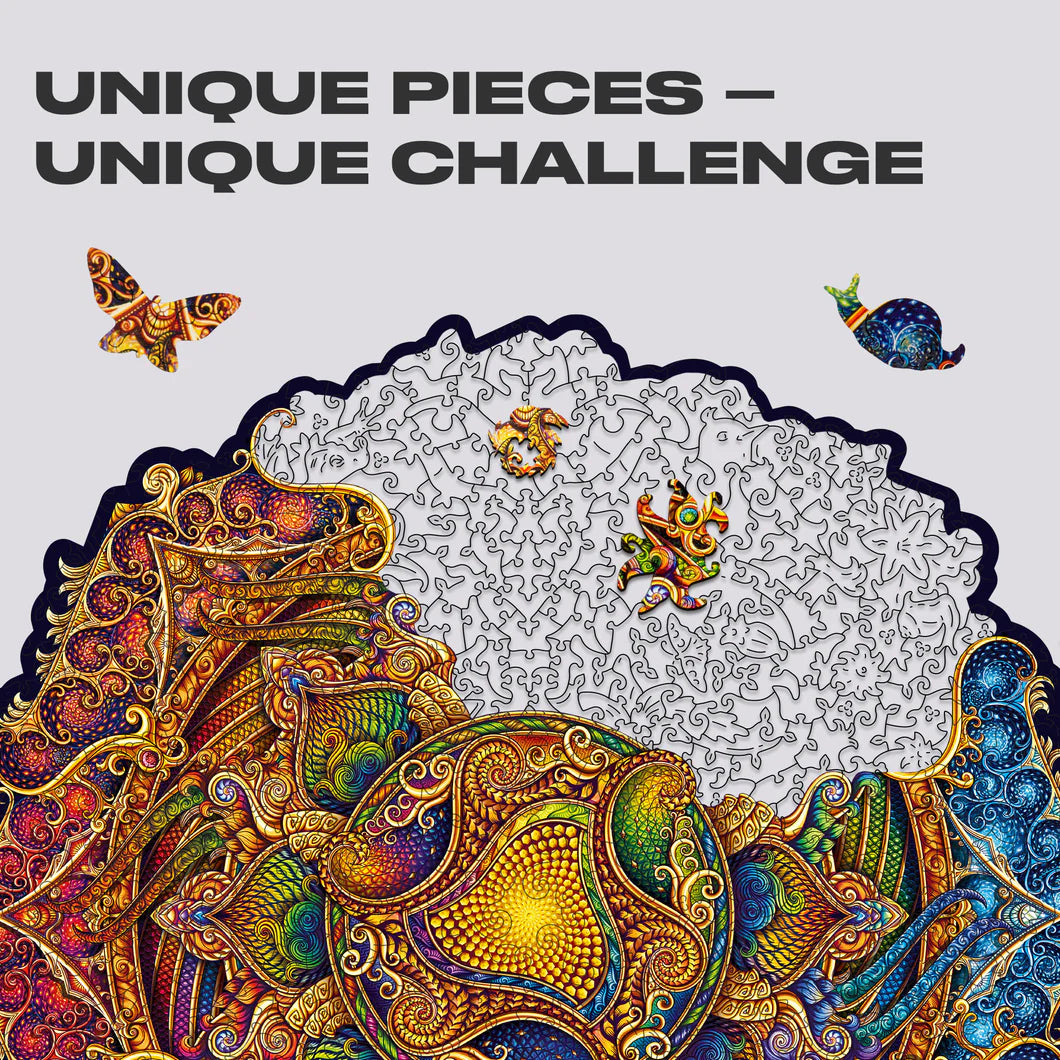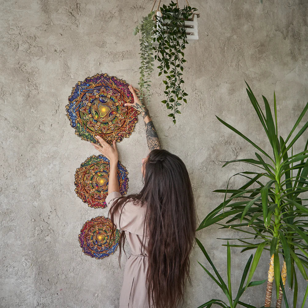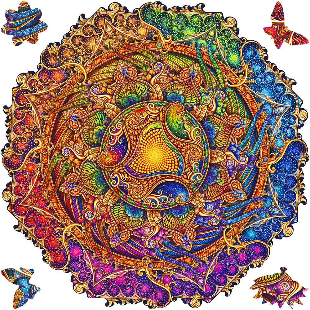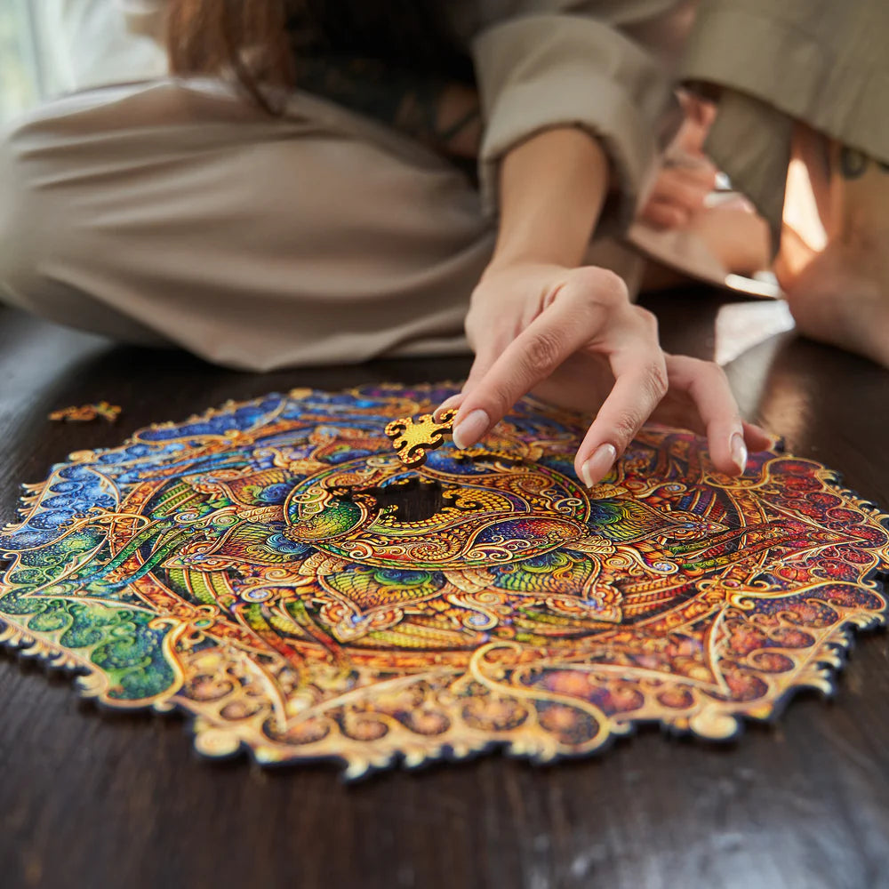 The Mandala series puzzles combine meditation and color therapy, allowing you to dive into the abstract space of thoughts and meet your real self along the way. Take your time, breath, and build the Mandala.
