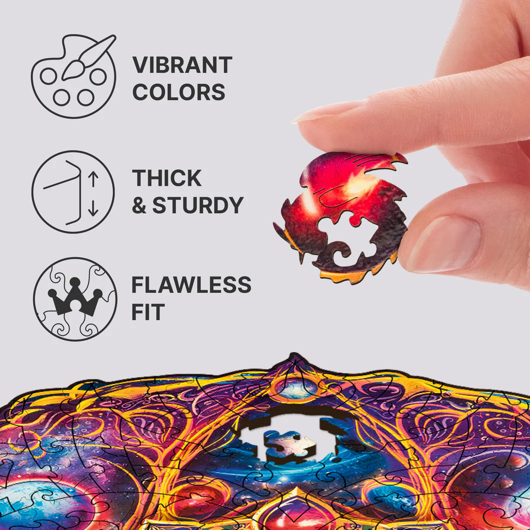 Many pieces echo elements of the illustration, like constellations scattered across a night sky. At the center lies a large mini-puzzle symbolizing the goal you are striving toward — and it can be assembled on its own.